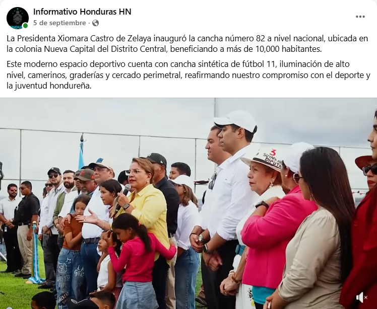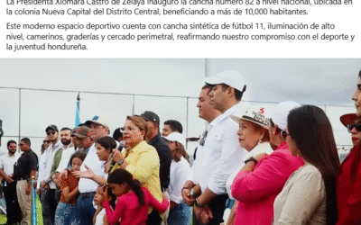 La Presidenta Xiomara Castro de Zelaya inauguró la cancha número 82 a nivel nacional, ubicada en la colonia Nueva Capital del Distrito Central, beneficiando a más de 10,000 habitantes. Este moderno espacio deportivo cuenta con cancha sintética de fútbol 11, iluminación de alto nivel, camerinos, graderías y cercado perimetral, reafirmando nuestro compromiso con el deporte…