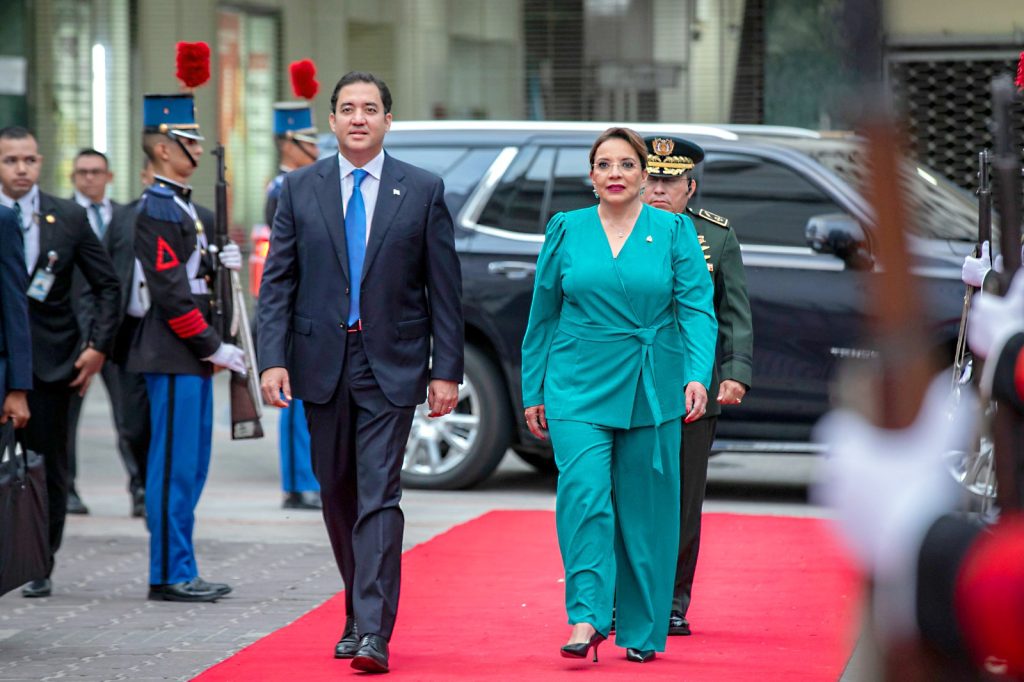En compañía de su hijo, Héctor Manuel Zelaya Castro, la mandataria llegó al parque Central de la capital de Honduras, donde se desarrollaron actos conmemorativos al 203 años de independencia patria.