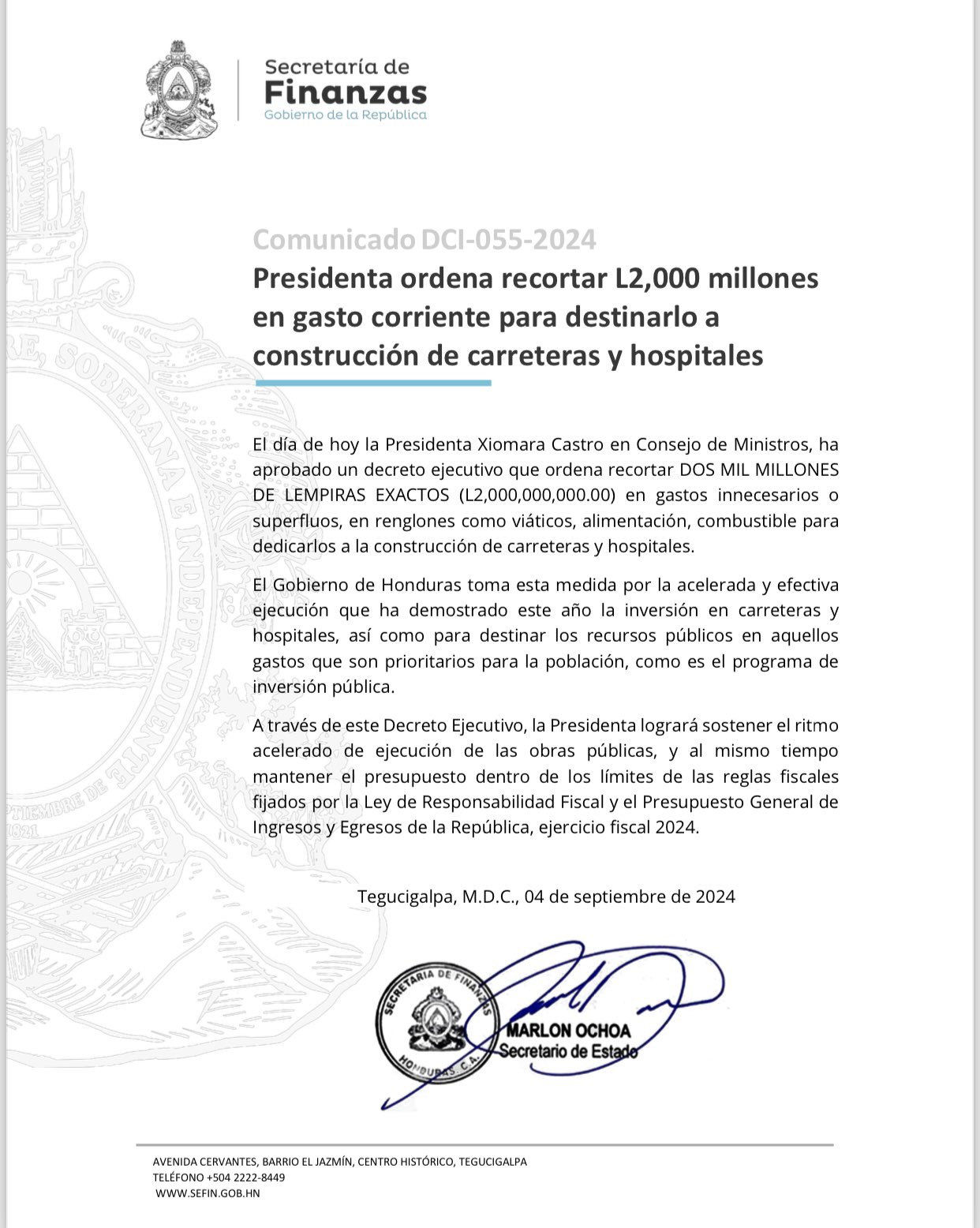 Gobierno ordena recorte de L 2 mil millones del gasto corriente para redirigirlo a hospitales y carreteras