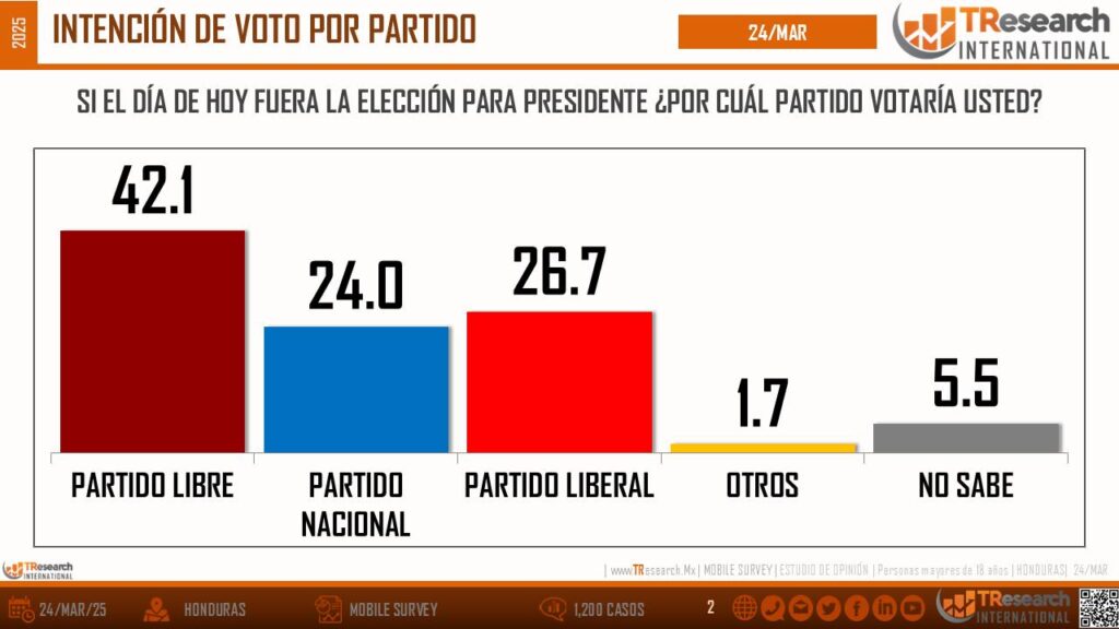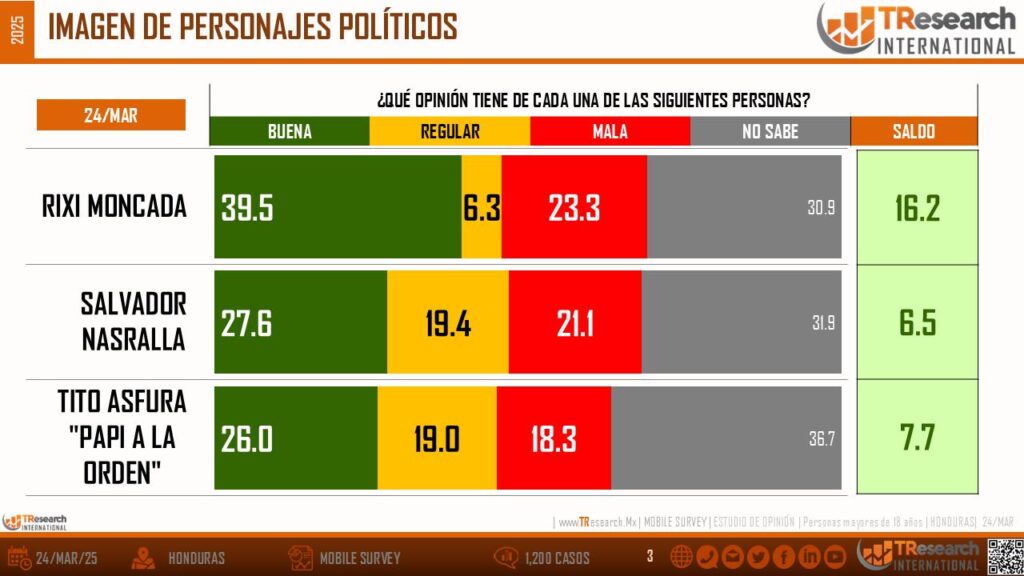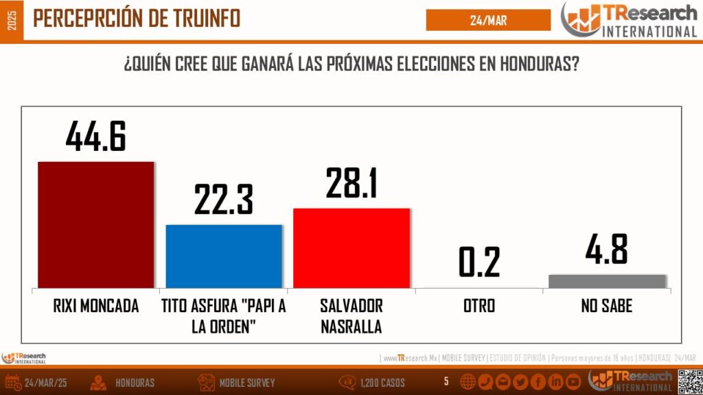 Sin embargo, la encuesta que cita Salum se llama “Honduras, así van: la carrera presidencial” donde en su slide 5 muestra datos manipulados, ya que, en el orden de los resultados, se posiciona en primer lugar Rixi Moncada, seguidamente de Nasry Asfura y por último Salvador Nasralla. Además, que Salvador presenta los datos como actuales, cuando la encuesta pretendía medir la percepción del voto en las elecciones primarias.