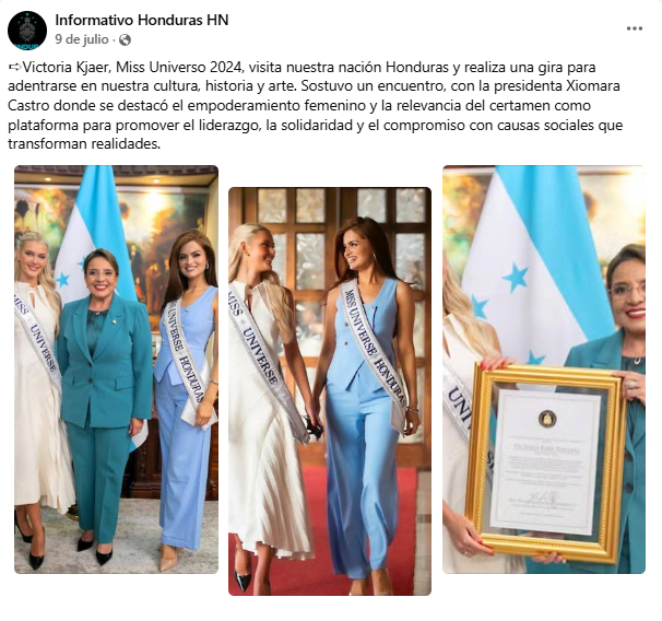 visita nuestra nación Honduras y realiza una gira para adentrarse en nuestra cultura, historia y arte. Sostuvo un encuentro, con la presidenta Xiomara Castro donde se destacó el empoderamiento femenino y la relevancia del certamen como plataforma para promover el liderazgo, la solidaridad y el compromiso con causas sociales que transforman realidades.