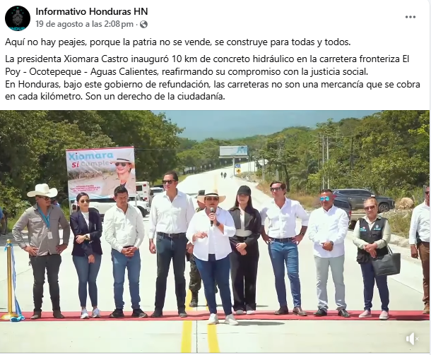 En Honduras, bajo este gobierno de refundación, las carreteras no son una mercancía que se cobra en cada kilómetro. Son un derecho de la ciudadanía.